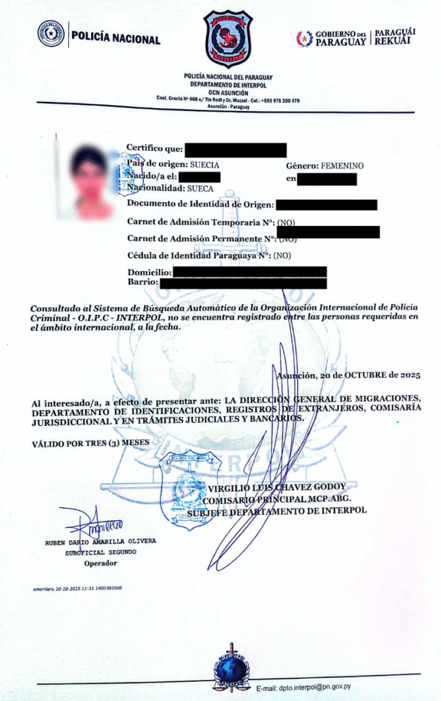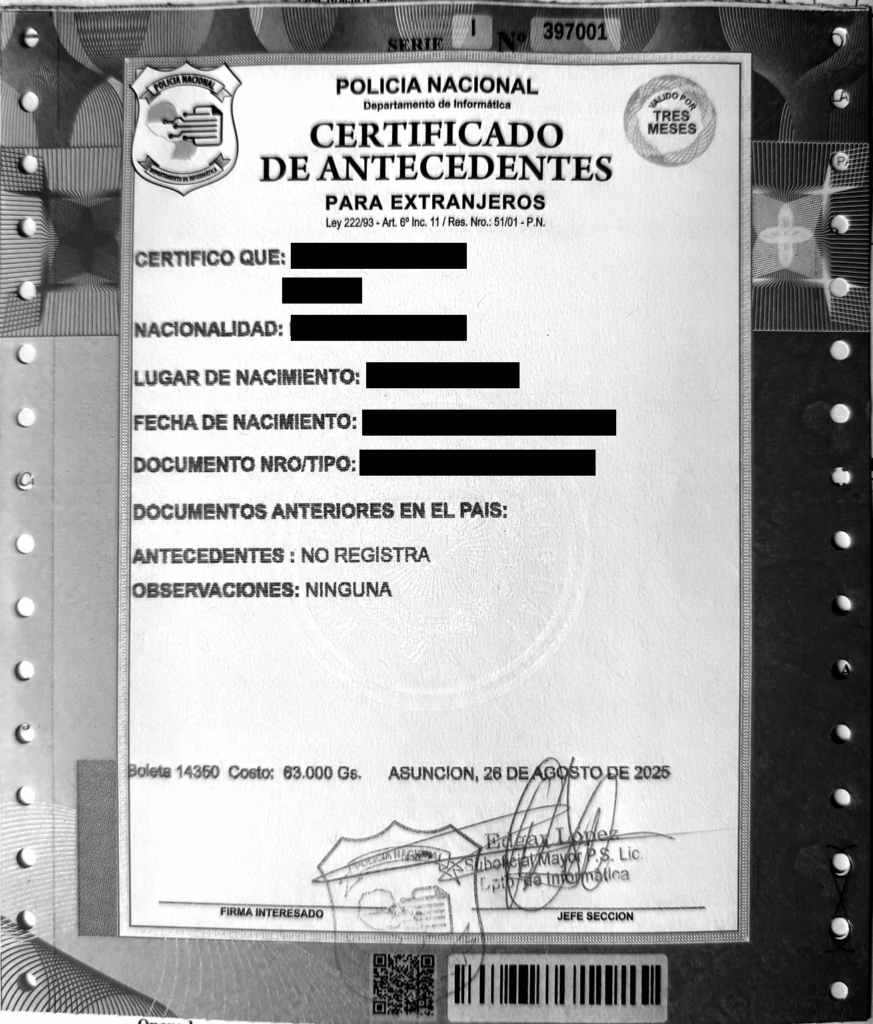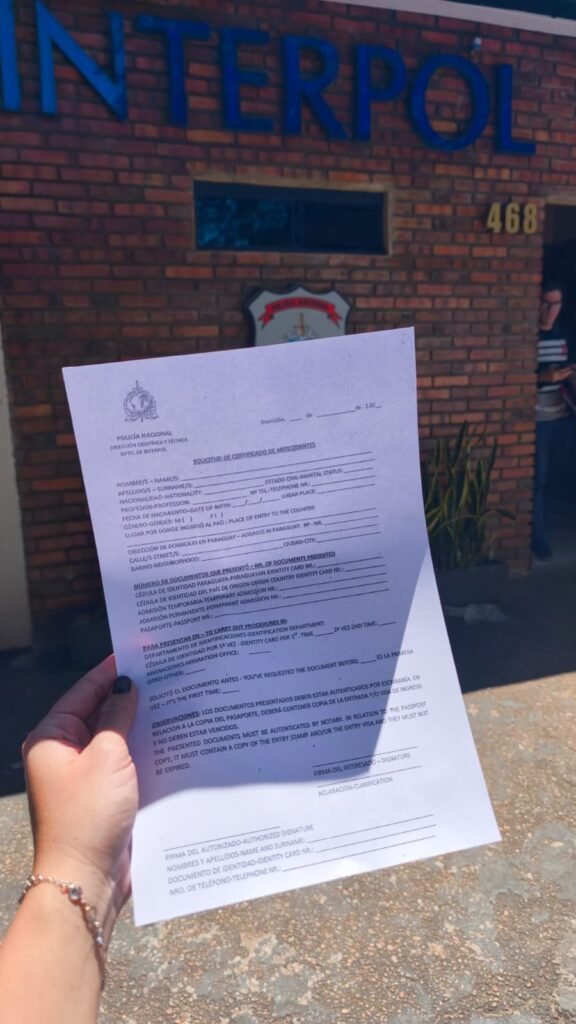 | Certificat d’Interpol | ~220 000 PYG | Étape 2 | Valable 3 mois |